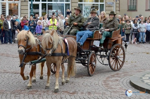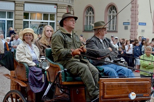 Von einem umfangreichen Polizei Aufgebot begleitet ging es dann zum Rathausplatz, wo sie von der Bläsergruppe des Kreisjägervereins Groß-Gerau empfangen wurden. Die meisten Kutschen waren historische Fahrzeuge, mit viel Liebe restauriert und für diesen Anlass besonders herausgeputzt. Harald Holla hatte für diesen Auftritt einen Jagdwagen gewählt und mit Freunden geladen, die ihn im Juli letzten Jahres beim großen Ausritt begleitet hatten. Ein großartiges Bild vor dem Rathaus, das gerade mit den Kutschen an Bilder aus alten Zeiten erinnerte.