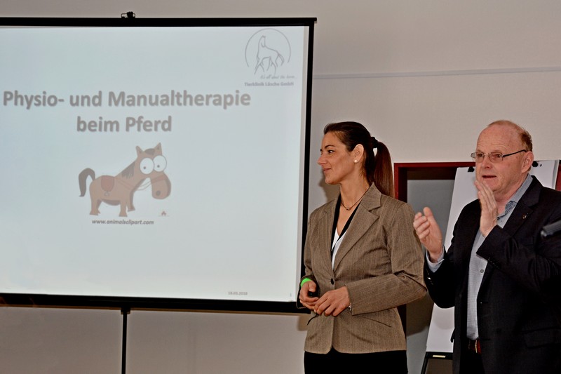 Besonders interessant der Vortrag von Dr. Kreling über die Berücksichtigung anderer Behandlungsmethoden durch den Tierarzt. Der Kreis der Firmen und Personen, die sich um die Gesundheit des Pferdes kümmern ist doch recht groß. Am Anfang steht natürlich der Reiter oder die Reiterin, unterstützt von Reitlehrer bzw. Bereiter. Der Hufschmied kommt regelmäßig, der Tierarzt mehr oder weniger ebenfalls. Er wird unterstützt vom Physiotherapeuten, Osteopathen, Chiropraktiker. Dazu kommt dann noch der Sattler und in manchen Ställen der Futtermeister. Wer weiß schon wirklich genau, was deren Aufgabe ist und wo sie seinem Pferd helfen können. Nur in der Kooperation zwischen Tierärzten und alternativen Behandlungsmethoden kann eine erfolgreiche und kostengünstige Lösung bei einem gesundheitlichen Problem gefunden werden.