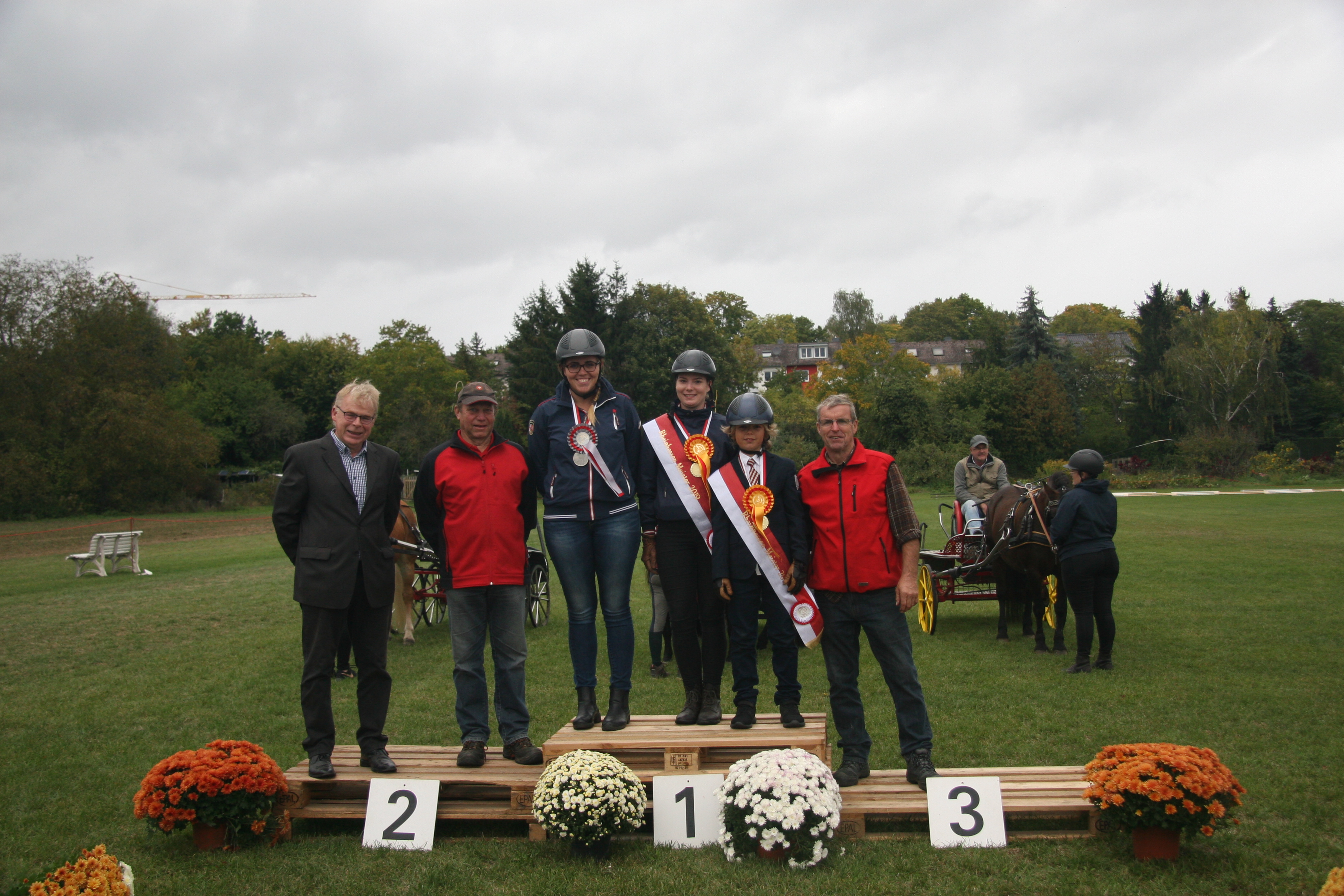 Zwischenzeitlich war der Geschäftsführer des Pferdesportverbandes Rheinhessen, Herr Klaus Colling eingetroffen, um sich einen Überblick zum Turniergeschehen zu verschaffen und an den anstehenden Sieger-und Meisterehrungen teilzunehmen. Er ließ es sich nicht nehmen, die Siegerschärpen und Medaillen bei den Meisterehrungen zur Rheinhessenmeisterschaft anzulegen. Zusätzlich gratulierten der rheinlandpfälzische Fahrsportkoordinator Theo Bopp und der erste Vorsitzende Ferdinand Werum den neuen Meistern. Der Titel Rheinhessenmeisterin der Einspänner 2019 ging an Lea Menger vom RFV Worms-Abenheim. Vizemeisterin wurde Dana Schöneberger vom gastgebenden Verein. Rheinhessenmeister der Zweispänner 2019 darf sich ab sofort Samuel Rudolph, ebenfalls für den RFV Mainz-Gonsenheim am Start, nennen. Mit der Ehrenrunde der neuen Rheinhessenmeister unter dem Applaus der Zuschauer endete dieses Fahrturnier. Der Veranstalter bedankte sich bei allen Helfern, Sponsoren und Fahrern und freut sich auf ein Wiedersehen im kommenden Jahr.