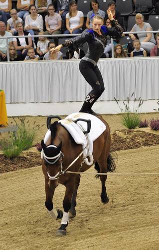 Das Niveau bei den S-Teams war in diesem Jahr einmal mehr sehr hoch, gerade an der Spitze zählte jeder noch so kleine Punkt. Auch bei den Einzelvoltigierern galt es, die Marke Top 10 zu knacken, um überhaupt an die Deutsche Elite heranzukommen. Das schafften zwei Voltigiererinnen aus Rheinland-Pfalz. Einmal Chiara Congia, beste Dame aus dem Landesverband. Sie hat sich im Juniorbereich mit etlichen Titeln bereits einen großen Namen gemacht hat. Mit neuem Pferd „Don Quichote“ und Alexandra Dietrich vom VFZ Mainz-Ebersheim kam die talentierte Studentin und Deutsche Juniormeisterin von 2015 auf Platz 8. Auch Jasmin Glahn konnte überzeugen und lieferte am Finaltag mit großartigem Ausdruck und Ausführung die viertbeste Kür der Damen ab. Platz 10 am Ende für die Bundenbacherin, die mit dem Ingelheimer Gespann Jürgen Köhler und Nabucco in den Zirkel einlief. Die beiden Pfälzerinnen Nadja Vogel und Barbara Köhler hatten in den ersten Umläufen Pech und mit nervösen vierbeinigen Partnern zu kämpfen. Für Barbara Köhler/PSG Zweibrücken, die von ihrer Mutter und Trainerin Ruth Köhler auf Wilenstein vorgestellt wurde, bedeutete dies Rang 26. Das Schwegenheimer Trio bestehende aus Nadja Vogel und Jacomo de Pucini mit Jacqueline Veth an der Longe kam auf Platz 24. Bei den Einzelherren war der Einstieg für den Bad Dürkheimer Konstantin Merk ebenso nicht leicht. Sein Wallach Eckstein machte es Longenführerin Viola Rüffel und ihm in der ersten Runde schwer, sein Leistungsniveau abzurufen – das kostete einen Abstand, der nicht mehr leicht einzuholen war und Rang 13 in der Gesamtwertung.