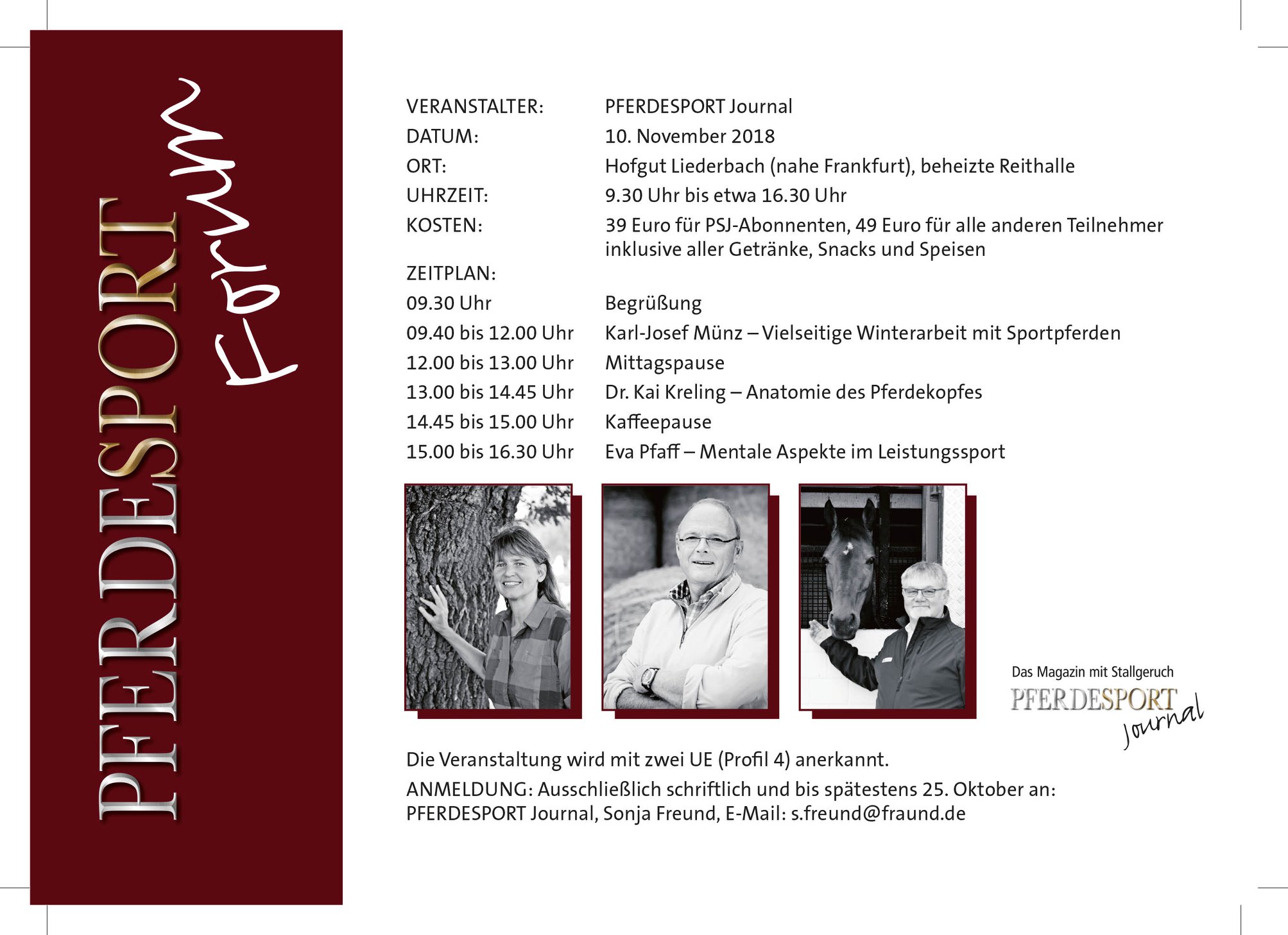 PSJ-Abonnenten zahlen für den Tag 39 Euro inklusive Getränke, Mittagessen und Snacks, alle anderen zahlen 49 Euro. Wer aber an diesem Tag ein Abo abschließt, bekommt die zehn Euro gutgeschrieben. Es sind schon fast die Hälfte der Plätze für das PFERDESPORT Forum ausgebucht. Wer sich jetzt noch anmelden möchte, sollte dies zeitnah tun. Anmeldungen bitte an