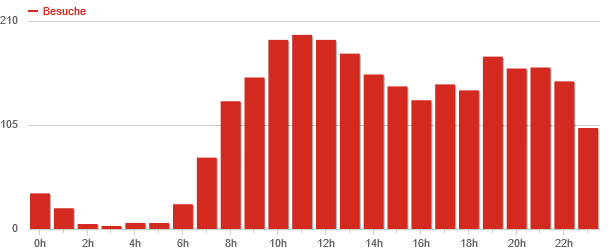 Eine nette Aussage bekommt man nach dem Aufruf, wann die Besucher auf die Homepage zugreifen. In der folgenden Statistik geschieht das meist gegen 14 Uhr, mit weiteren Spitzen um 10 und 20 Uhr.