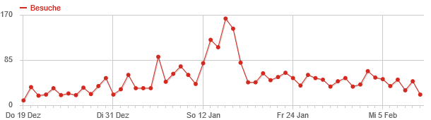 Der Administrator der Homepage kann die täglichen Zugriffe sich über beliebige Zeiträume anzeigen lassen. In der nachstehenden Grafik die Anzahl von Besuchern vom 19. Dezember 2013 bis zum 28. Januar 2014. Mit 163 Zugriffen sticht der 15. Januar 2014 klar heraus. Was könnte der Grund sein? Nun, am 11. Januar 2014 war der Reiterball auf der Laubenheimer Höhe und vermutlich haben die Besucher nach Bildern von diesem Ball gesucht.